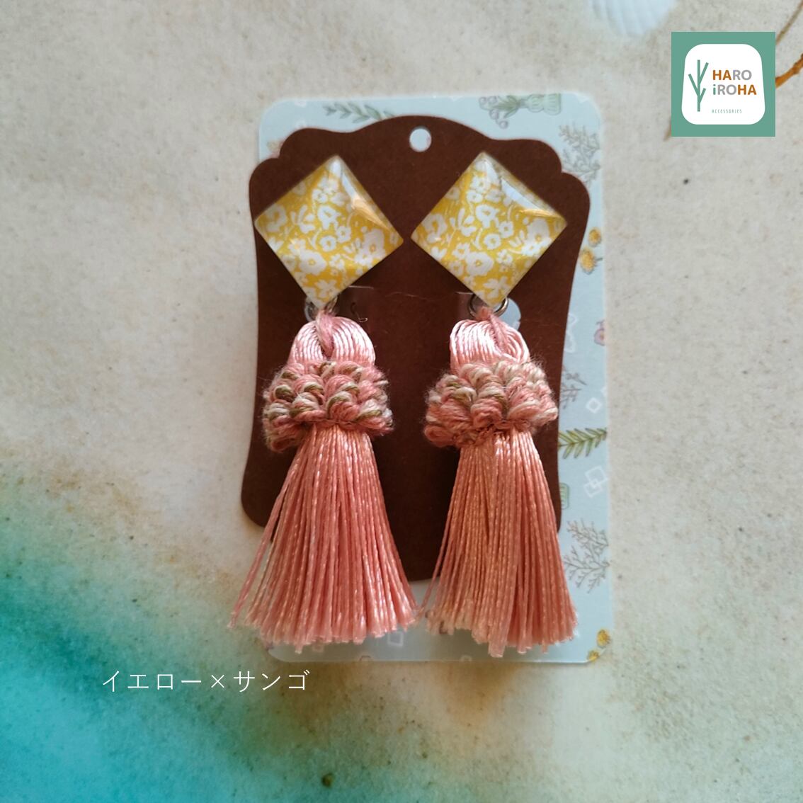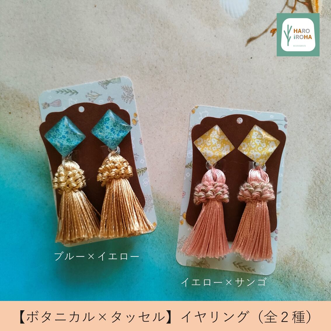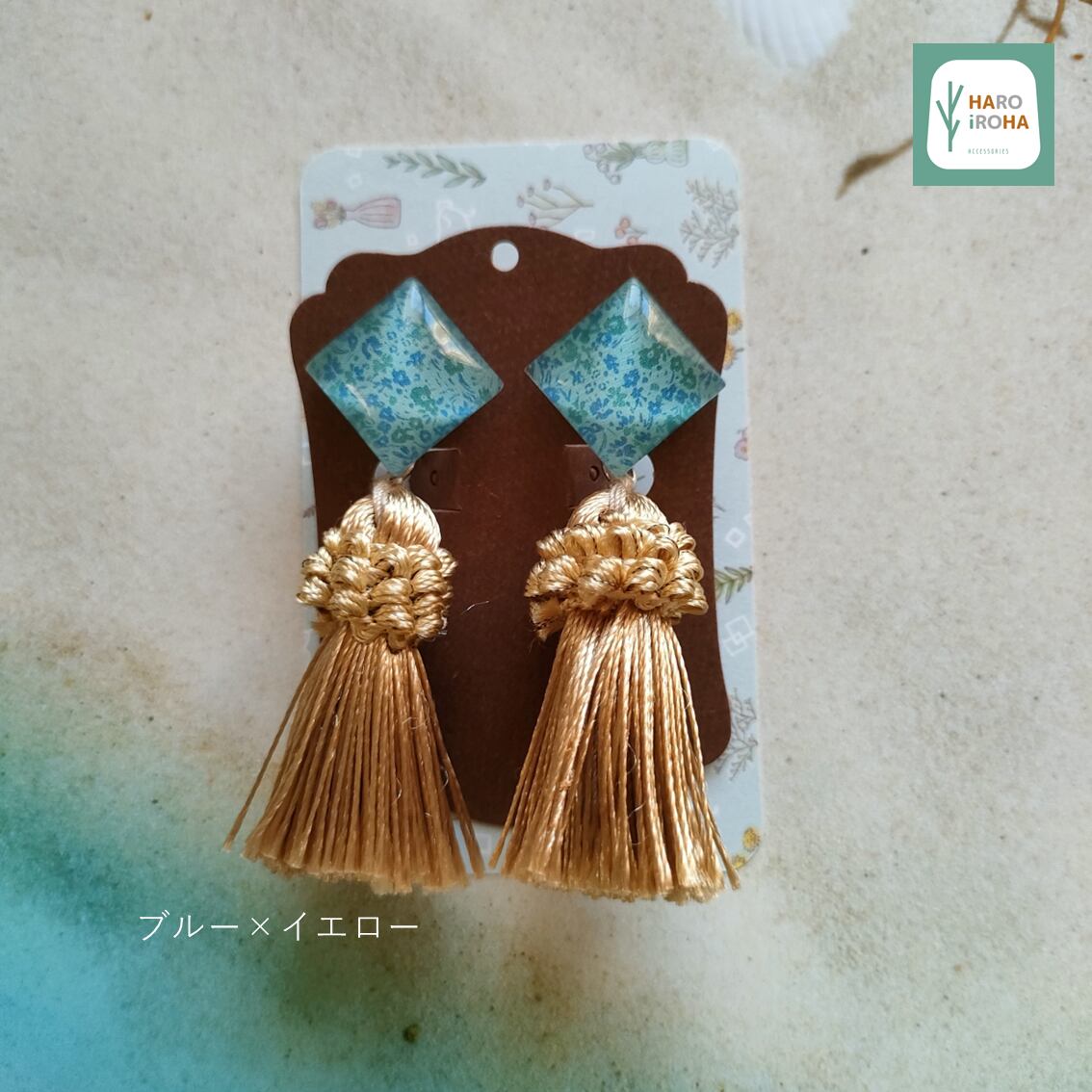 夏にぴったりな爽やかな印象のイヤリング!透明感のあるボタニカル柄のタイルと揺れるタッセルが組み合わさり、耳元を華やかに彩ります。自然を感じるデザインはリゾート・ファッションとの相性も良く特別な雰囲気を演出します。