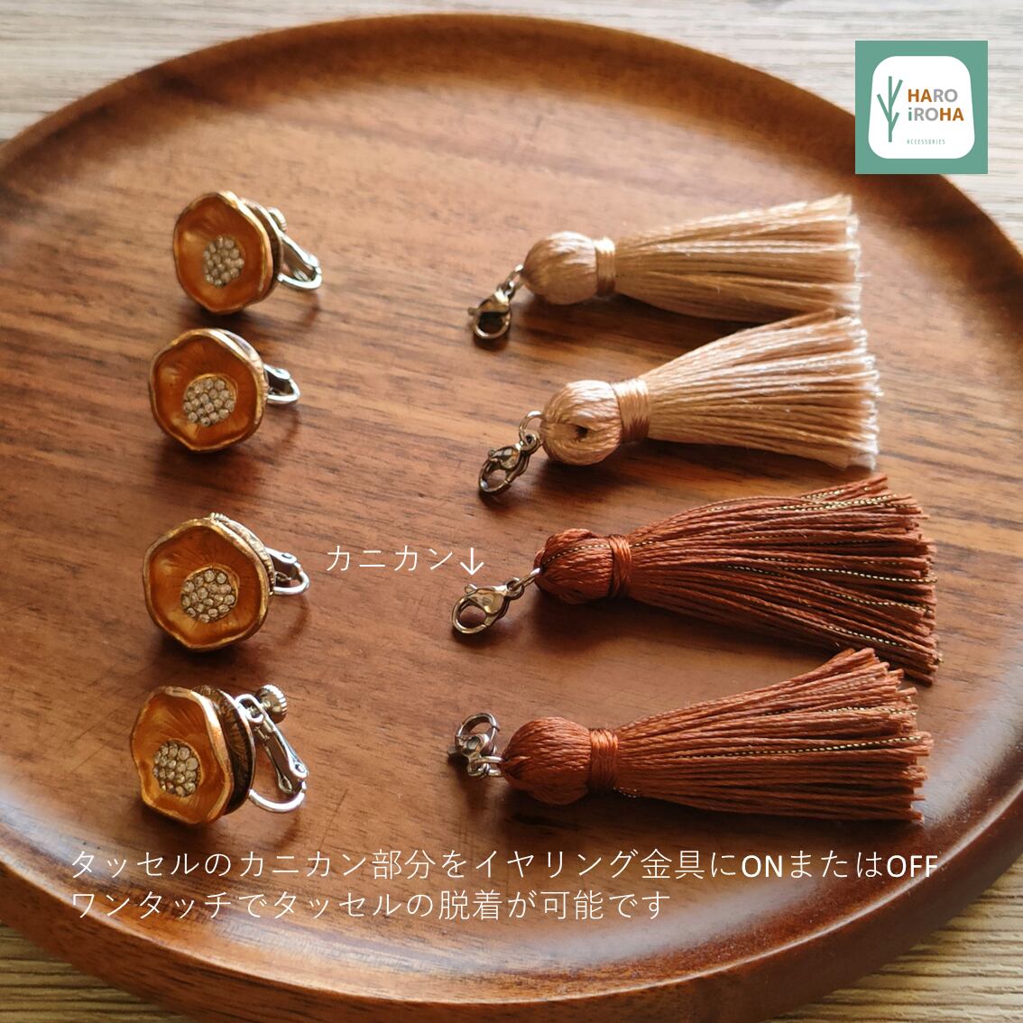 タッセル側のカニカンをイヤリング金具のU字の部分に引っかけて固定または外して2Wayスタイルでご使用いただけます。