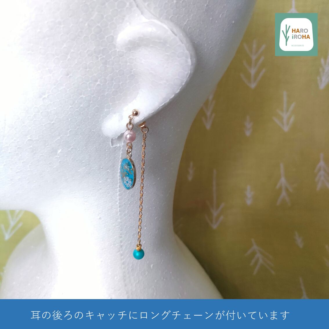 「ピアス本体のBLUEのチャーム」と「ピアスキャッチに付いているロングチェーン先のBLUEのパール」が共鳴するような誰ともかぶらないデザインを、自由な発想で使っていただけますように☆彡