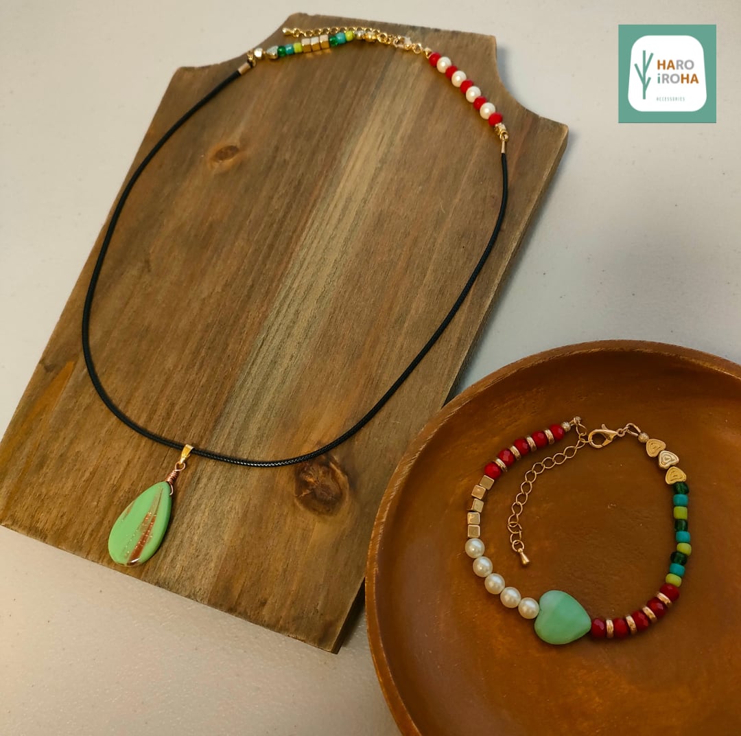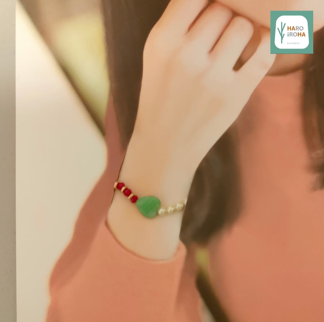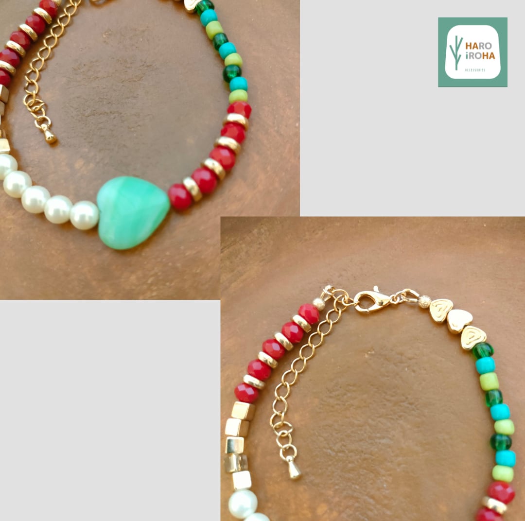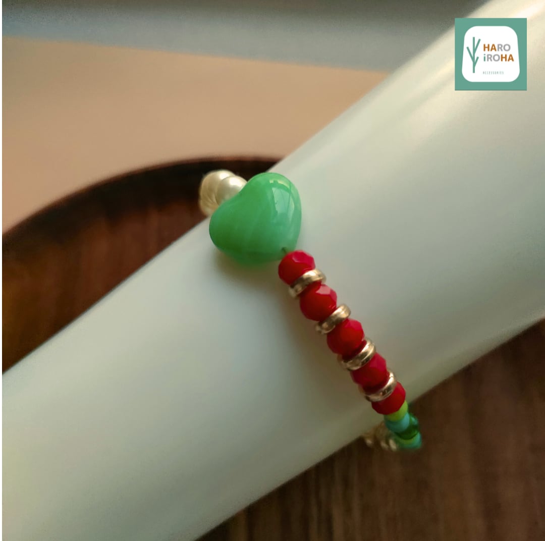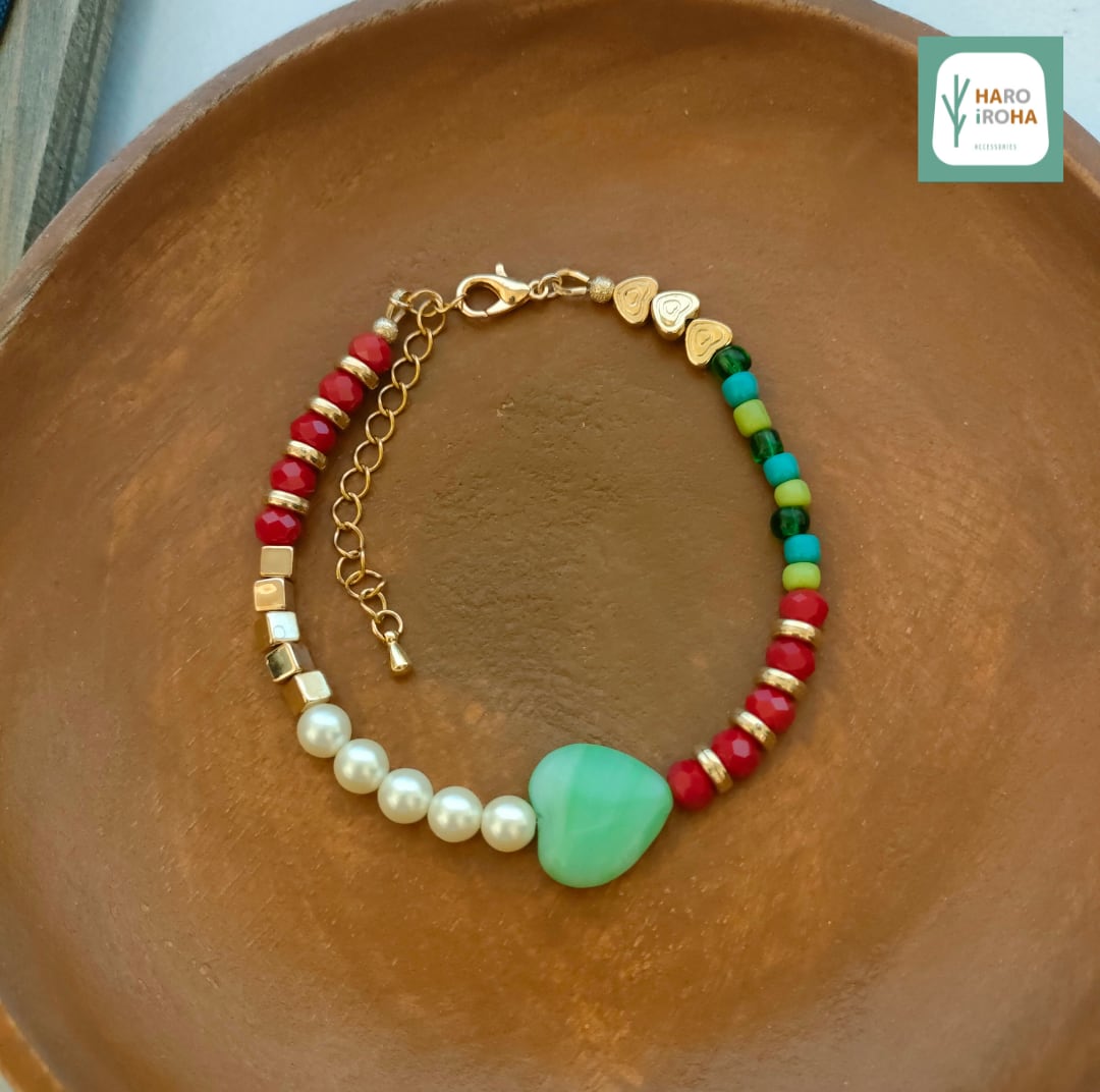 ”木漏れ日”のように優しい色彩の「ハート型のガラスビーズ」をセンターに、周囲に明るい色合いのビーズやパールを配置しました。手元を華やかに彩るオリジナルデザインのブレスレットです。