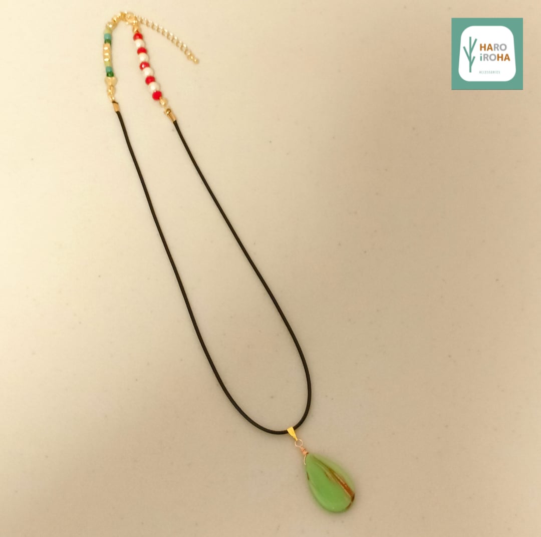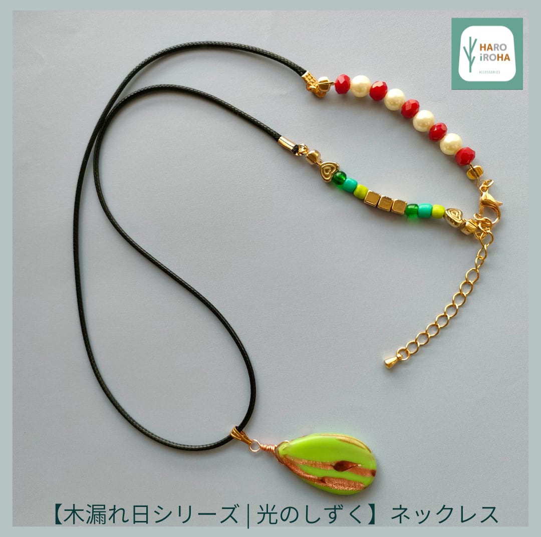 ”木漏れ日”のように優しい色彩の「しずく型のガラスビーズ」をペンダントトップにしました。しずくには美しいゴールドのラインが「光」のように刻まれています。留め具の両端に明るい色合いのビーズやパールを配置しました。後ろから見た時にも、さり気ないお洒落を演出するアイテムです。