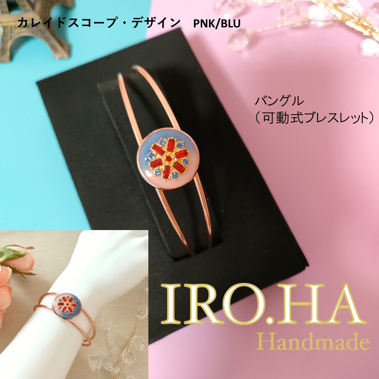 ブレスレット「カレイドスコープ(kaleidoscope=万華鏡)デザイン PNK/BLU」をご紹介します。ピンクとブルーのベースに、赤や青のクリスタルガラスを織り交ぜたデザインは、まるで万華鏡のようにキラリと繊細な光を放ちます。やさしい色合いと上品な輝きが、手元を華やかに彩ります。和装のワンポイントにもお薦めです。
