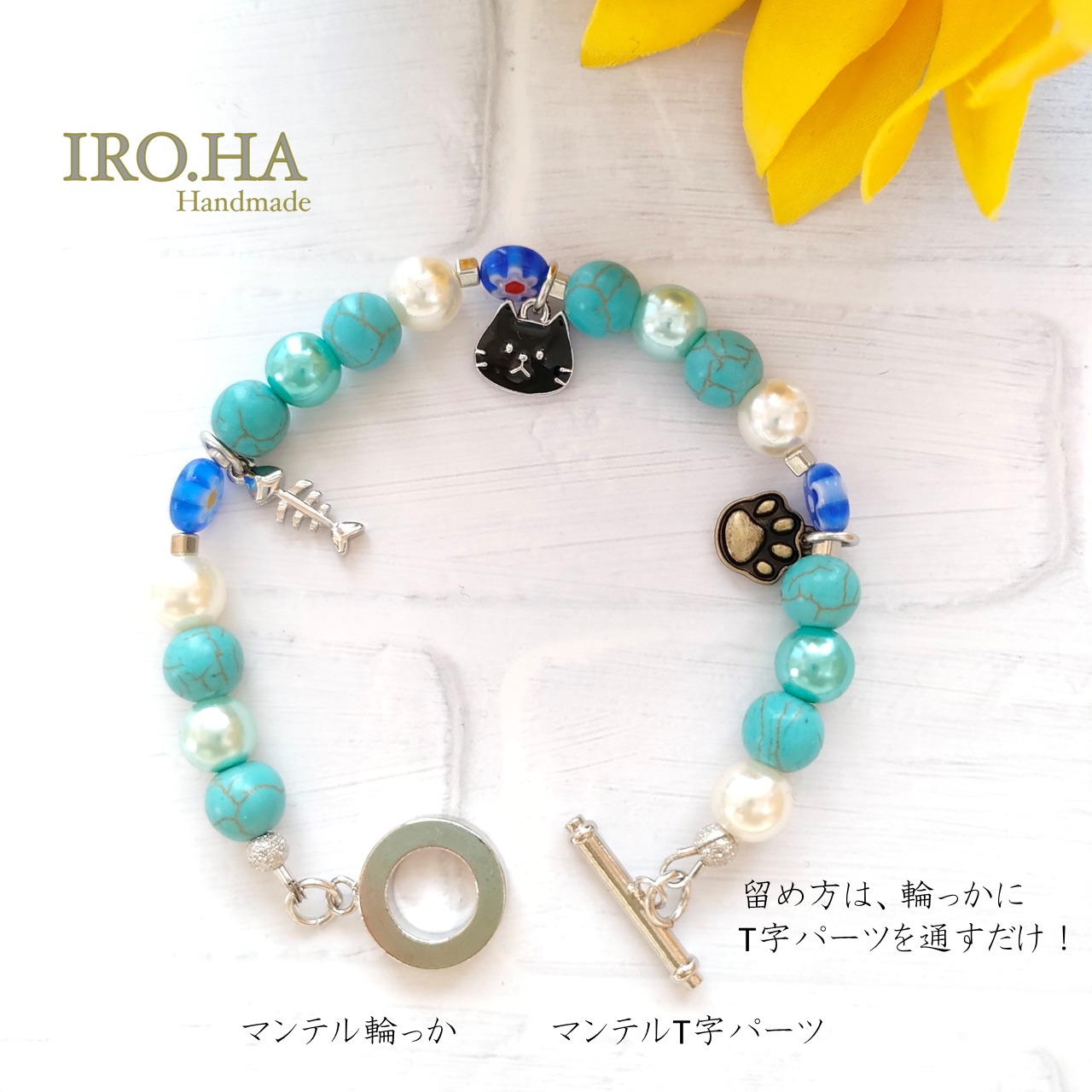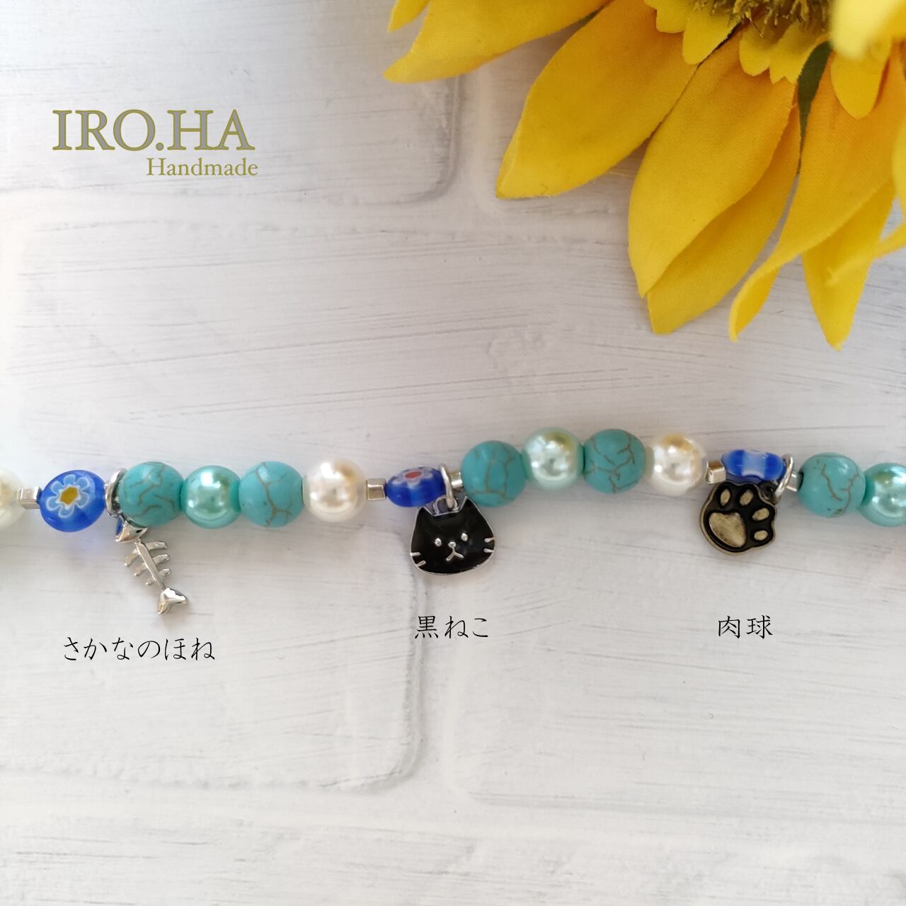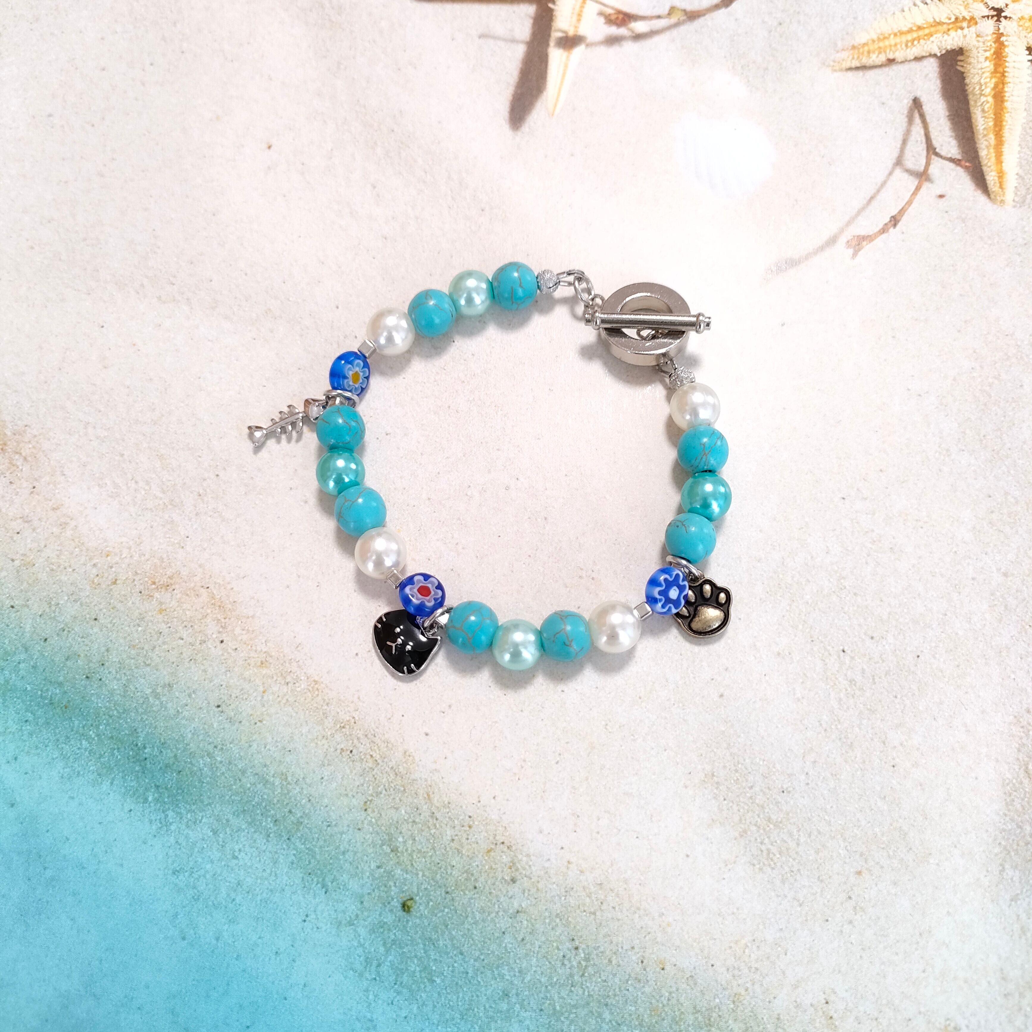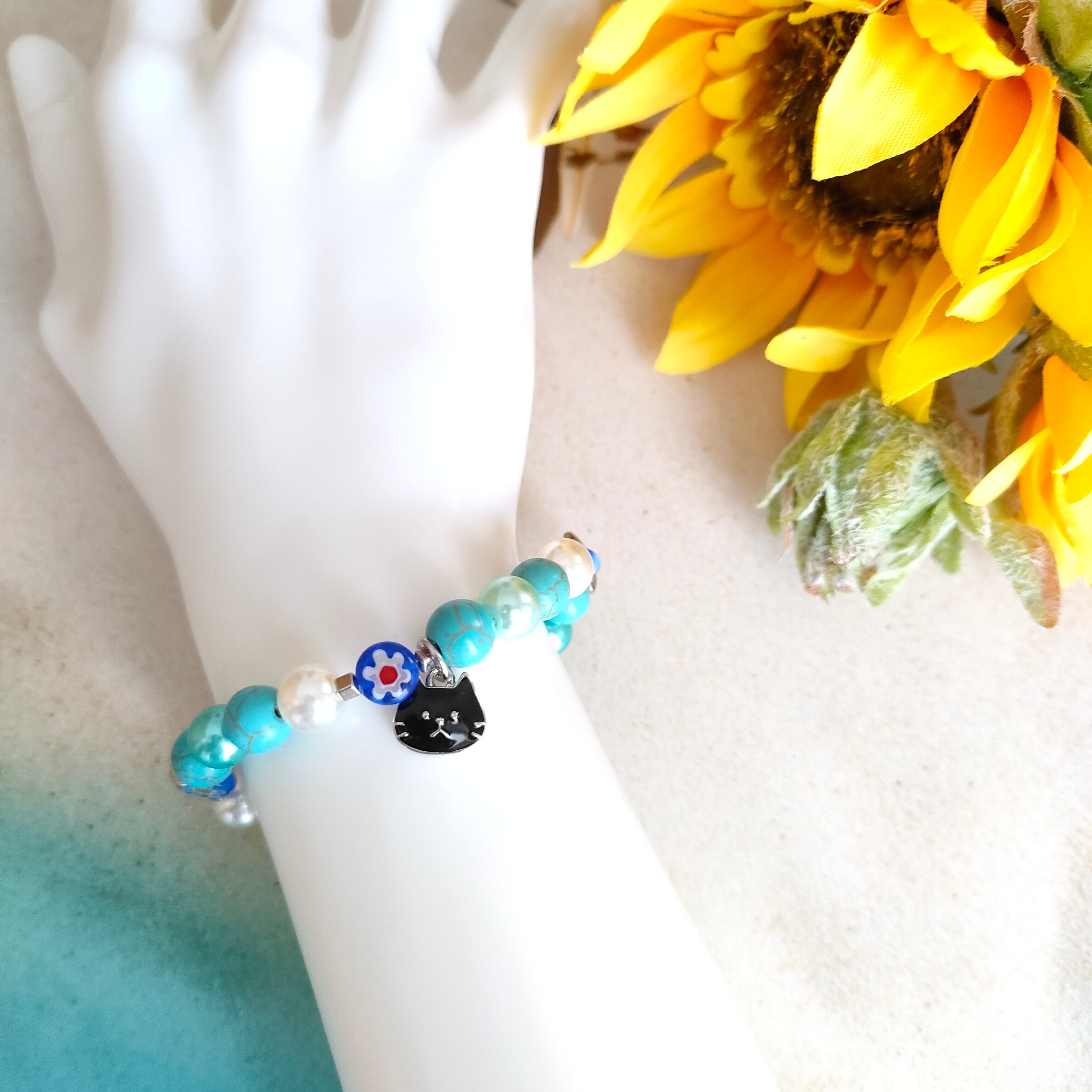 【あの日、海辺で出会ったねこ】ブレスレットは、大人かわいいアクセサリーです。ブルー系の大ぶりなターコイズ(石)やパール調のパーツ、等間隔に配置されたミルフィオ・ガラスビーズが爽やかで上品なハーモニーを奏でます。さり気なく揺れる3種のねこに関するキュートなチャームが遊び心をくすぐります。(黒ねこバージョン)