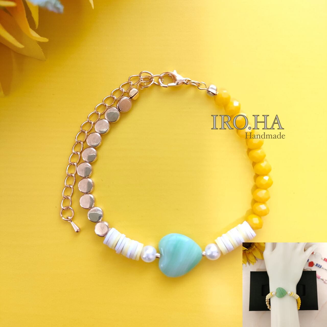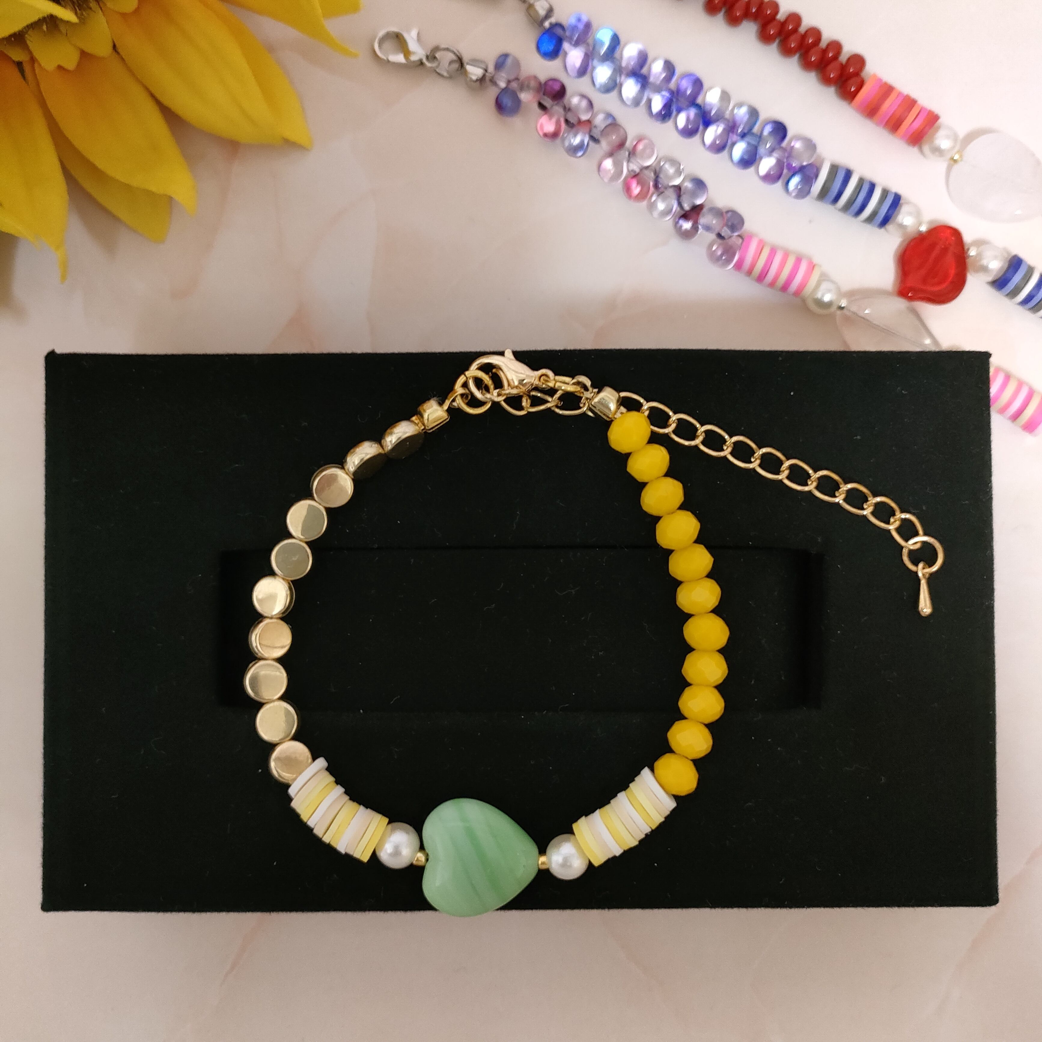 心が躍るようなカラフルな日々を過ごせるように【colorful days】と名付けられた、レモンイエローカラー(黄色系)のブレスレットをお届けします。アートなデザイン、鮮やかな色彩が絶妙に融合した華やかなブレスレットは、あなたのお洒落を一層引き立てます。メタルパーツの存在感もクールで、コーディネートのアクセントに最適です。中心の大きなモチーフ(ミルキーグリーンのハート)は希少なチェコガラスを使用しています。