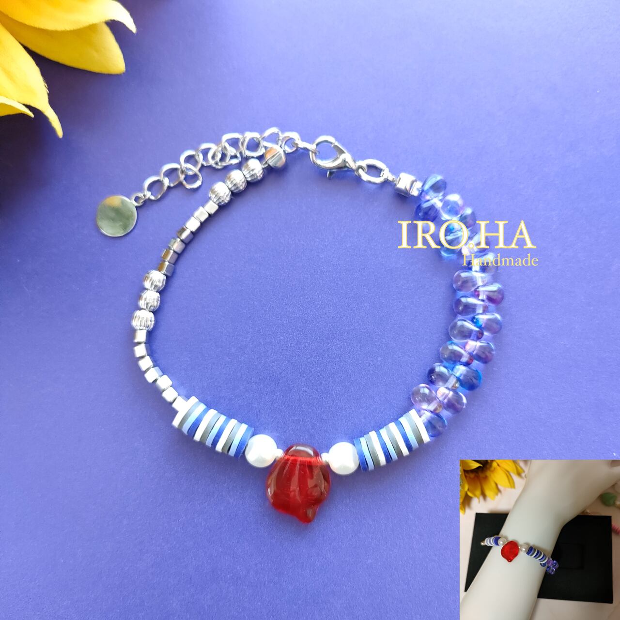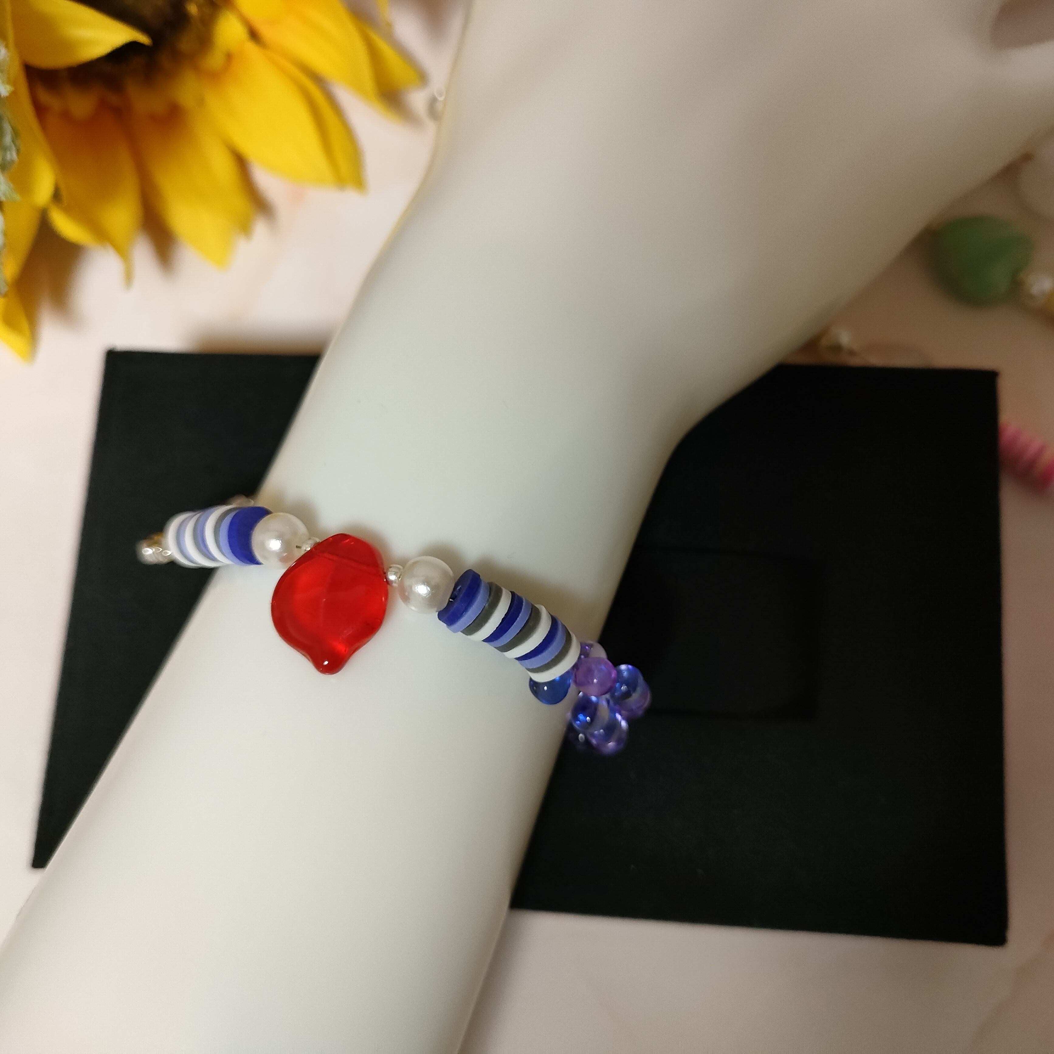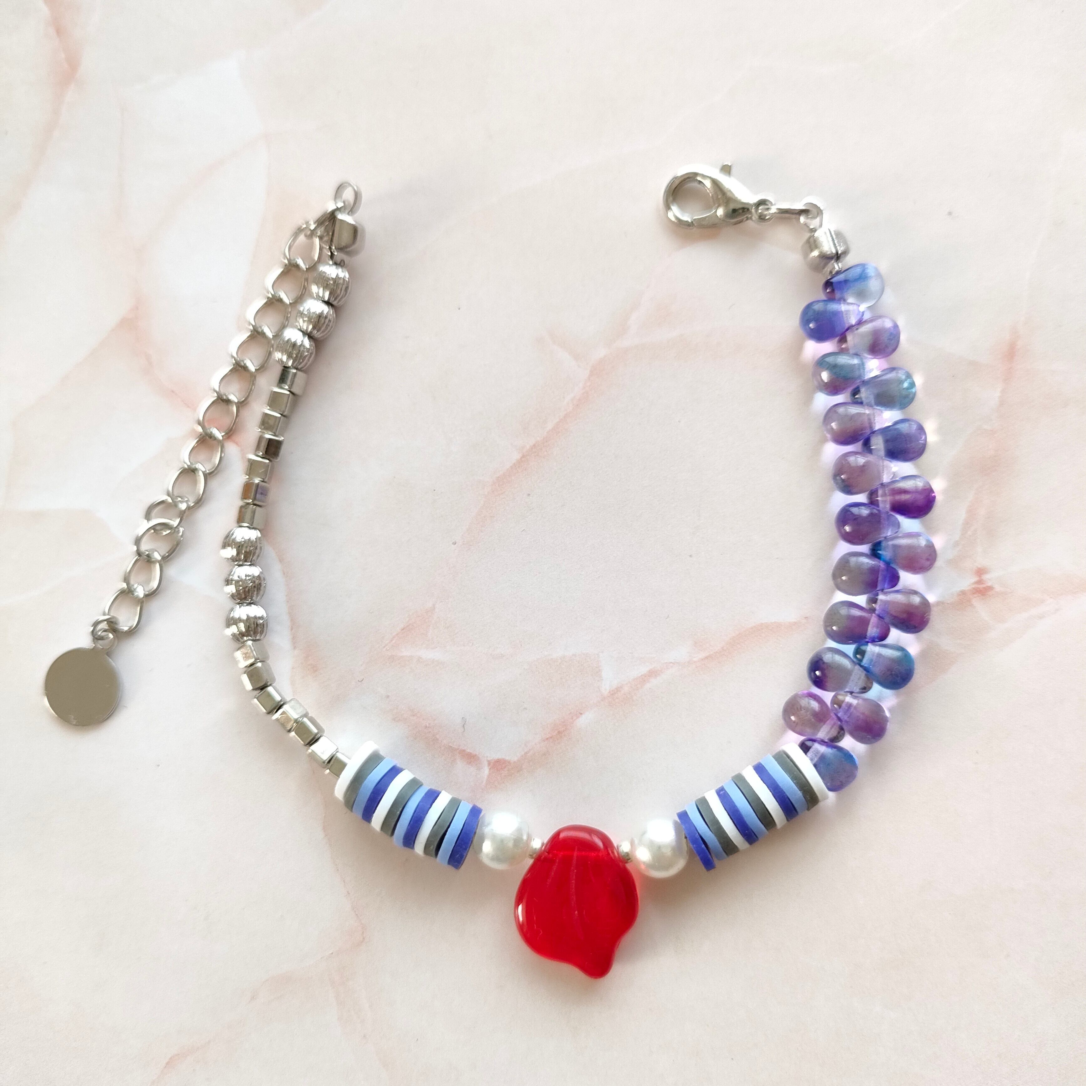 心が躍るようなカラフルな日々を過ごせるように【colorful days】と名付けられた、ブルーベリーカラー(紫系)のブレスレットをお届けします。アートなデザイン、鮮やかな色彩が絶妙に融合した華やかなブレスレットは、あなたのお洒落を一層引き立てます。メタルパーツの存在感もクールで、コーディネートのアクセントに最適です。中心の大きなモチーフ(赤い花びら)は希少なチェコガラスを使用しています。