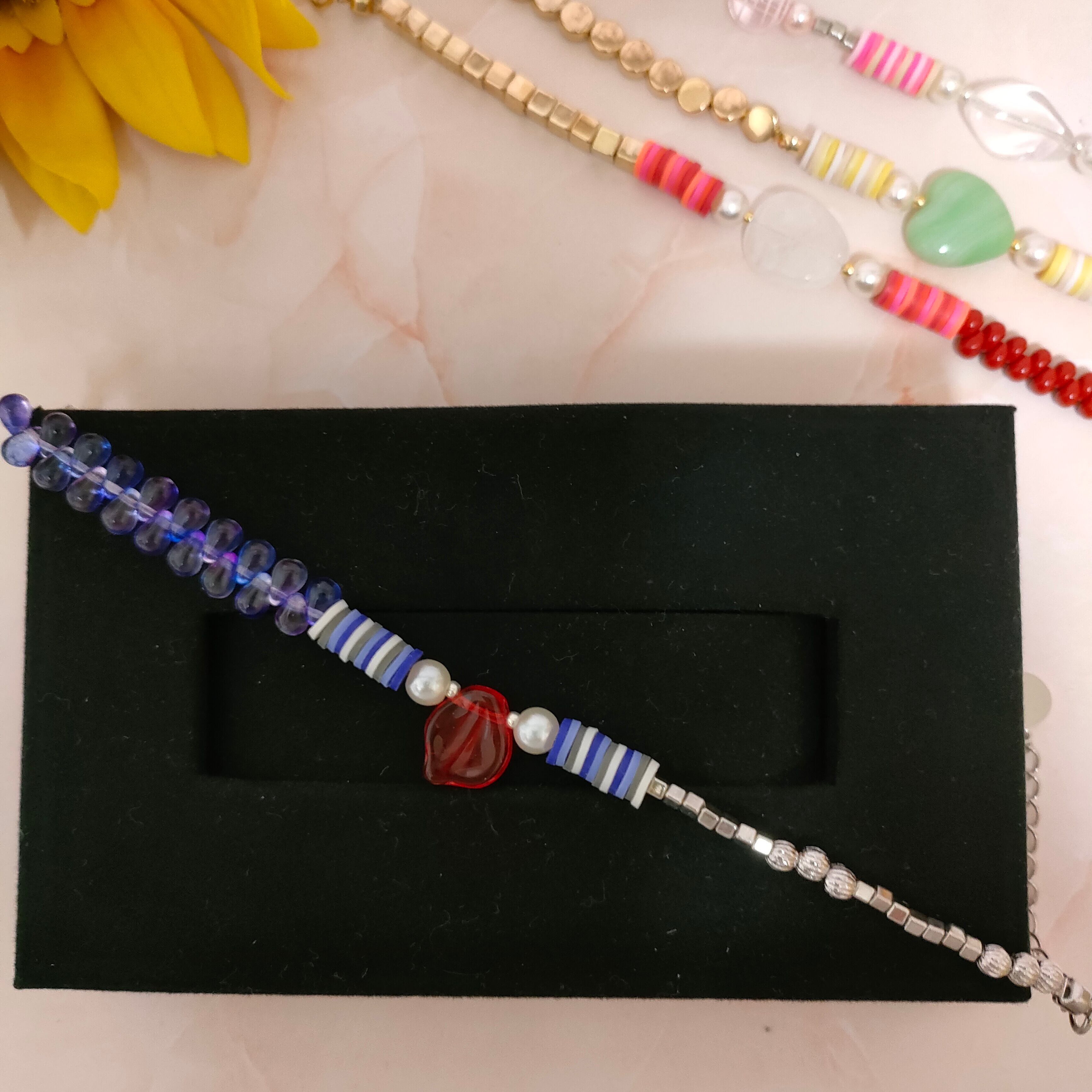 このブレスレットは普段使いにも、パーティーシーンにもぴったり。夏のシンプルなTシャツやワンピースのコーデに個性的で華やかなアクセントを加えてくれます。手元を見るたびに楽しくなるブレスレットで、素敵な一日をお過ごしください。