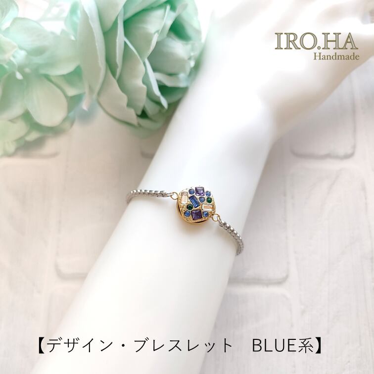 繊細なデザインが魅力のBLUE系デザイン・ブレスレット。キラキラと光を反射する細やかなデザインのクリスタルガラスを贅沢に使用した石座が、輝きを放っています。ブルーを基調としたカラーにグリーンやクリアカラーのアクセントが楽し気なリズムを加えています。