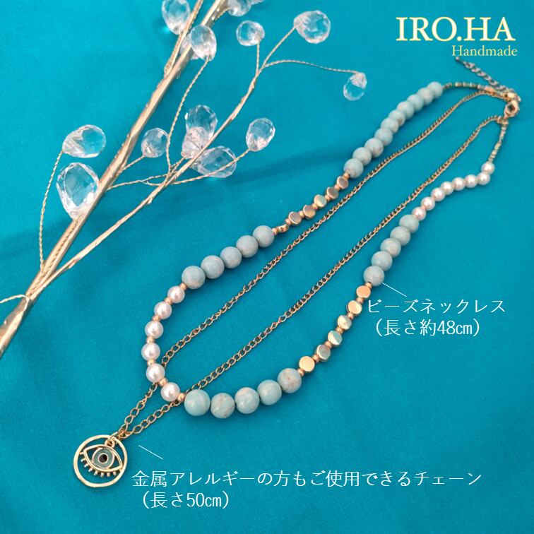 チェーン部分には金属アレルギー対応のサージカルステンレス316製を採用しています。ビーズと共に、お肌に安心な素材となっております。