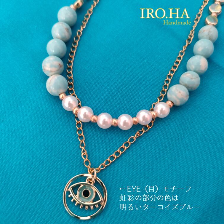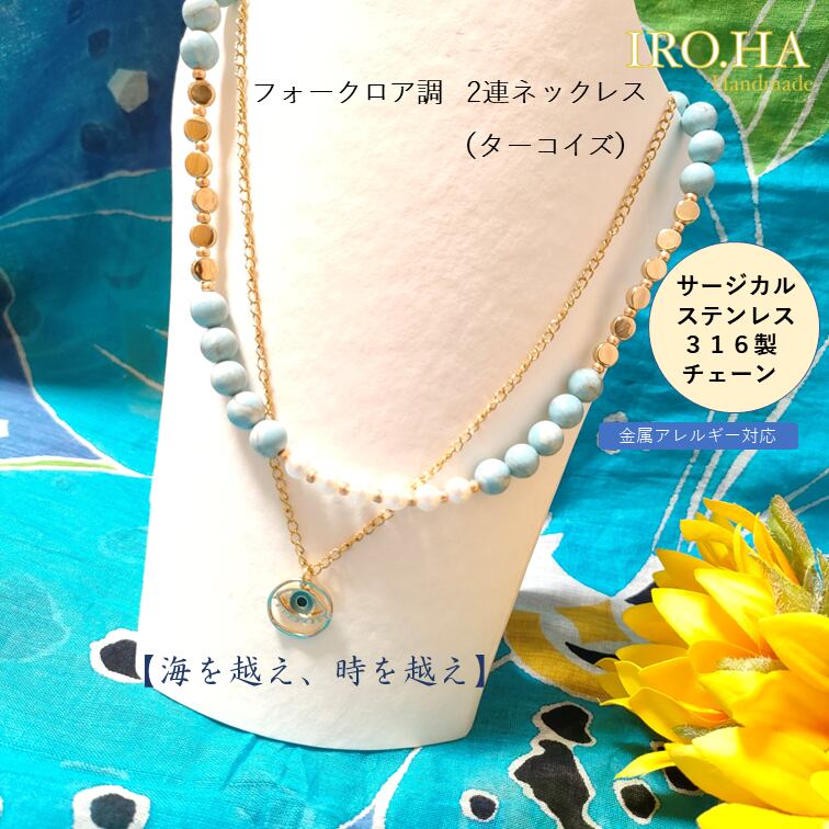 「フォークロア調 2連ネックレス(ターコイズ)」は、淡いブルーのターコイズ(練り)とパールのハーモニーが印象的なネックレスです。爽やかな配色でありながらエスニックな雰囲気が漂うアイテムです。