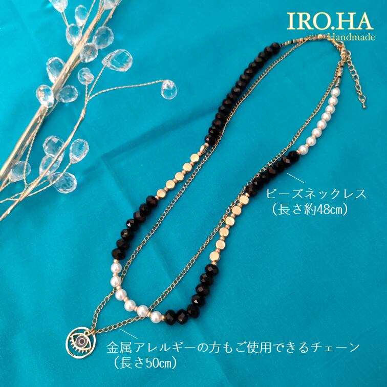チェーン部分には金属アレルギー対応のサージカルステンレス316製を採用しています。ビーズと共に、お肌に安心な素材となっております。