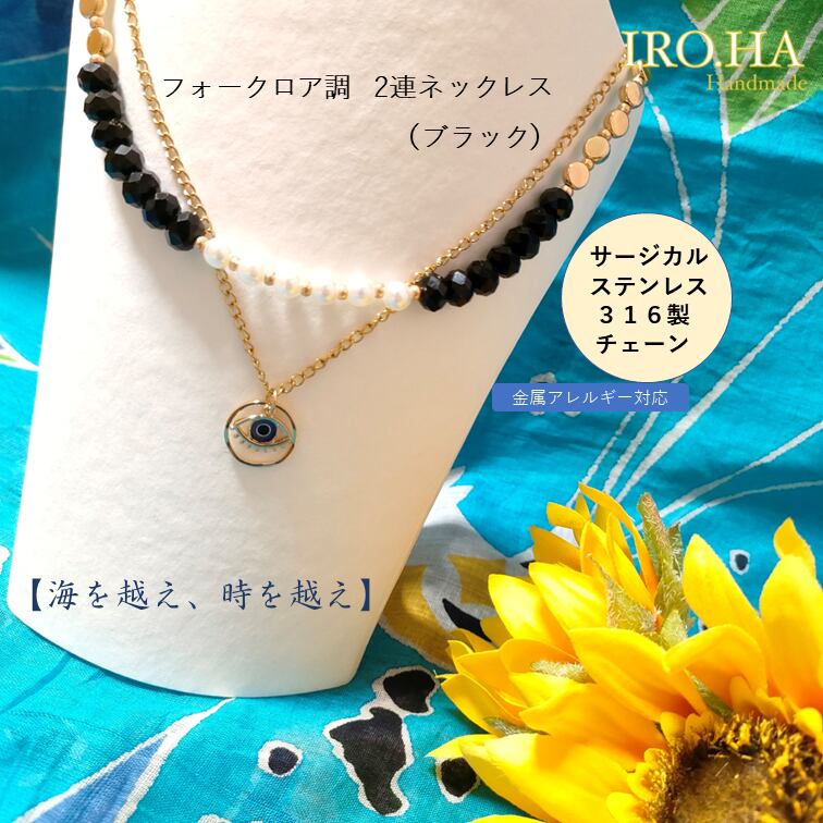 このネックレスは同じシリーズのブレスレット(「フォークロア調 2連ブレスレット」(ブラック×ゴールド」)との親和性が高く、一緒にコーディネートしていだだきますと、より一層お洒落の幅が広がりそうです。軽い素材なので長時間つけていても疲れにくく、普段使いからパーティーの装いまで幅広くご使用いただけます。