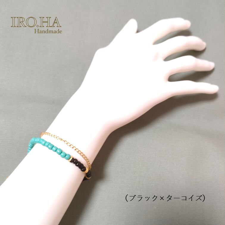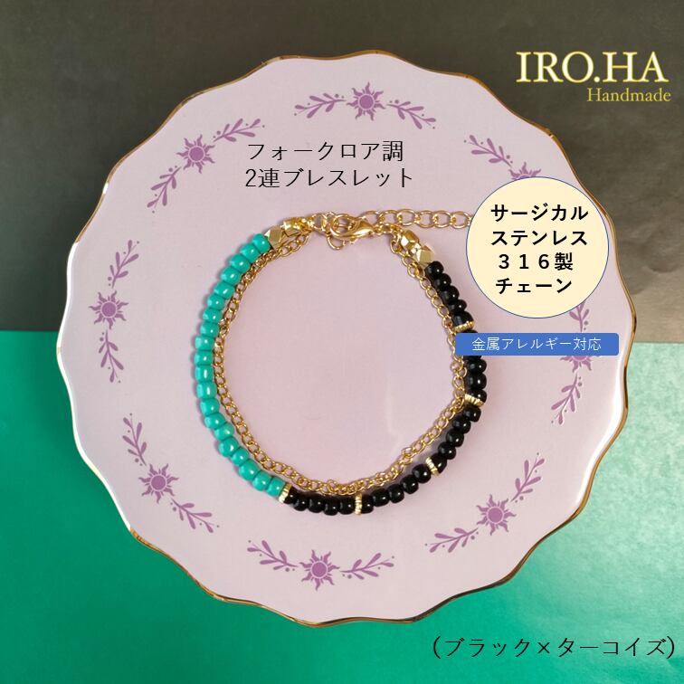 エスニックな雰囲気漂うフォークロア調の2連ブレスレットです。ブラックとターコイズブルーの組み合わせが鮮やかで、コーディネートのアクセントとなるアイテムです。