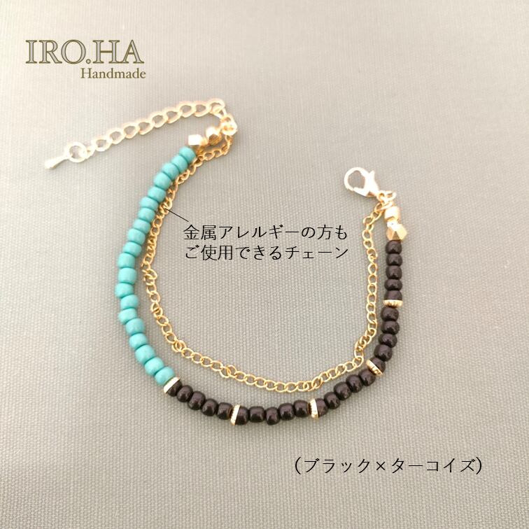 チェーン部分には、金属アレルギー対応のサージカルステンレス316製を採用しています。ビーズと共に、お肌に安心な素材となっております。