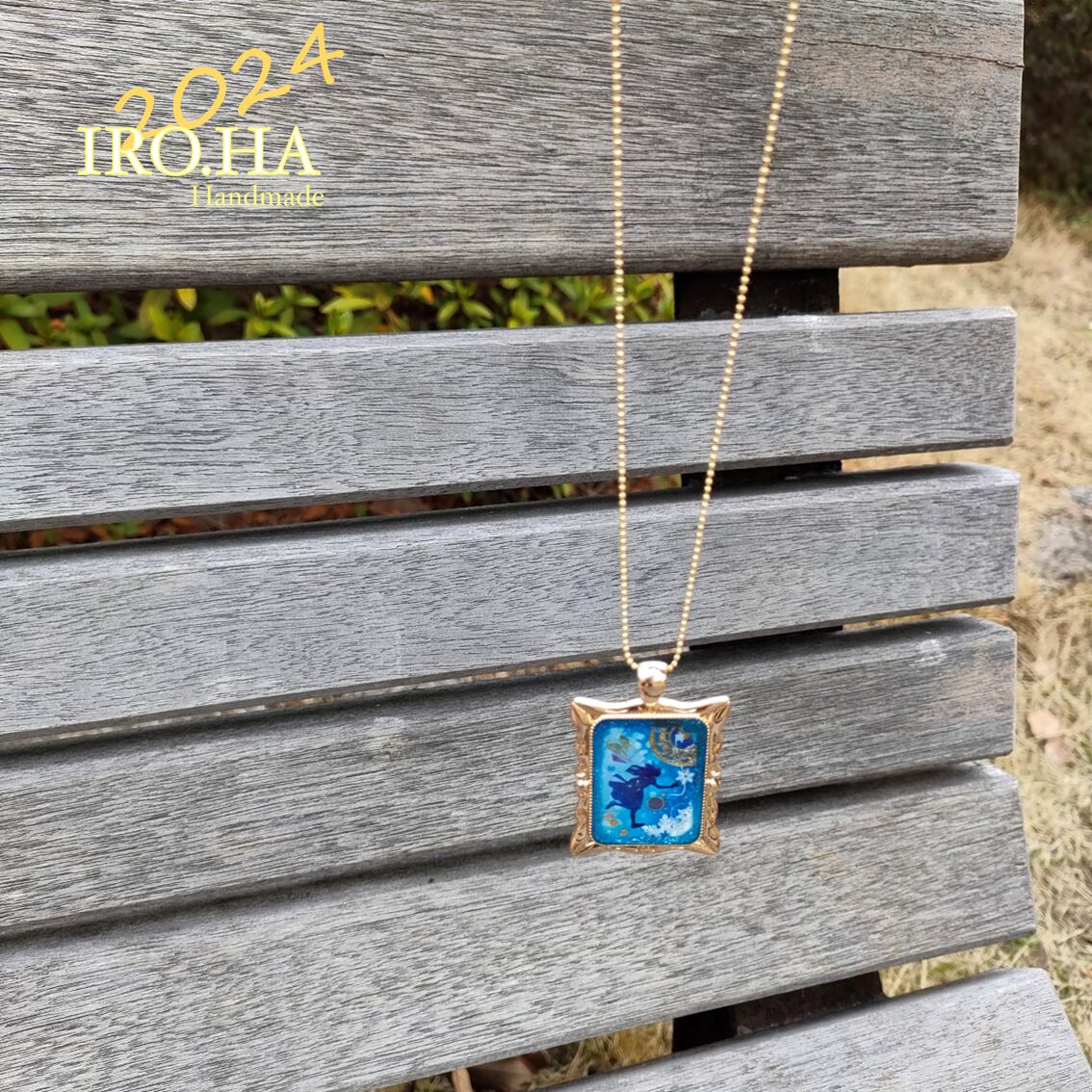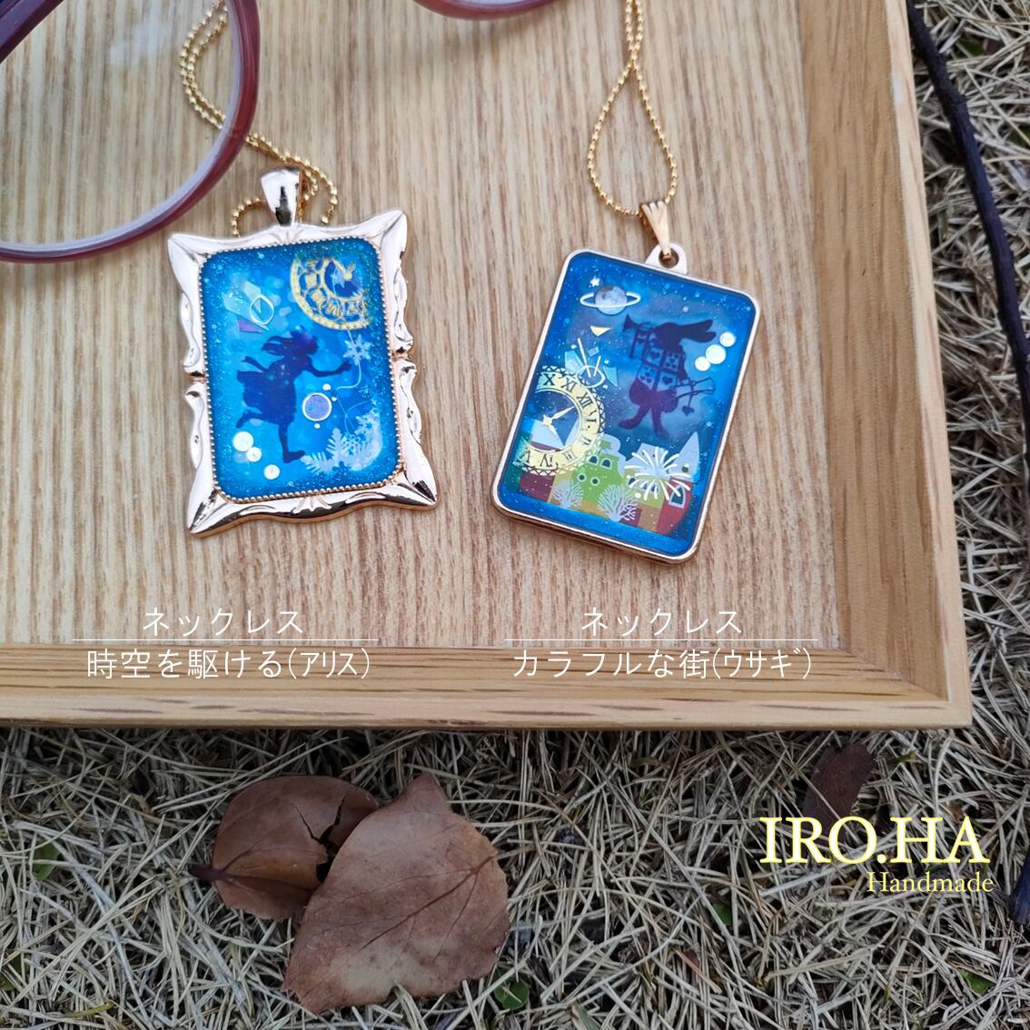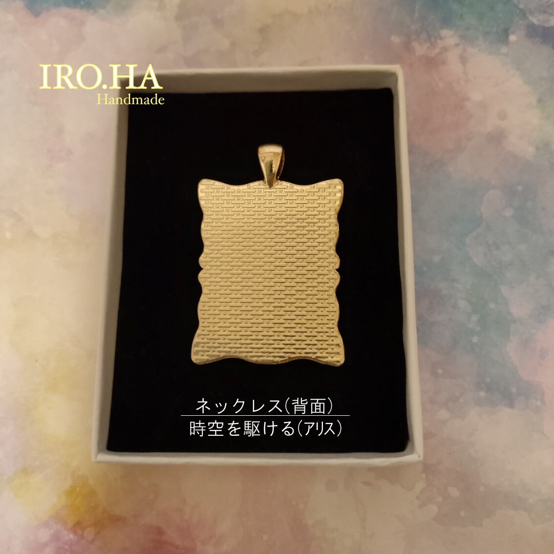 このネックレスのペンダント・トップ(額縁のような長方形のチャーム部分)には、パブリックドメイン(著作権フリー)の”不思議の国のアリス”に登場する女の子"アリス"のキャラクターが、幻想的な空間を駆け抜けているシーンを表現しています。細部の装飾にもこだわったIRO.HAだけのユニークなアクセサリーです。